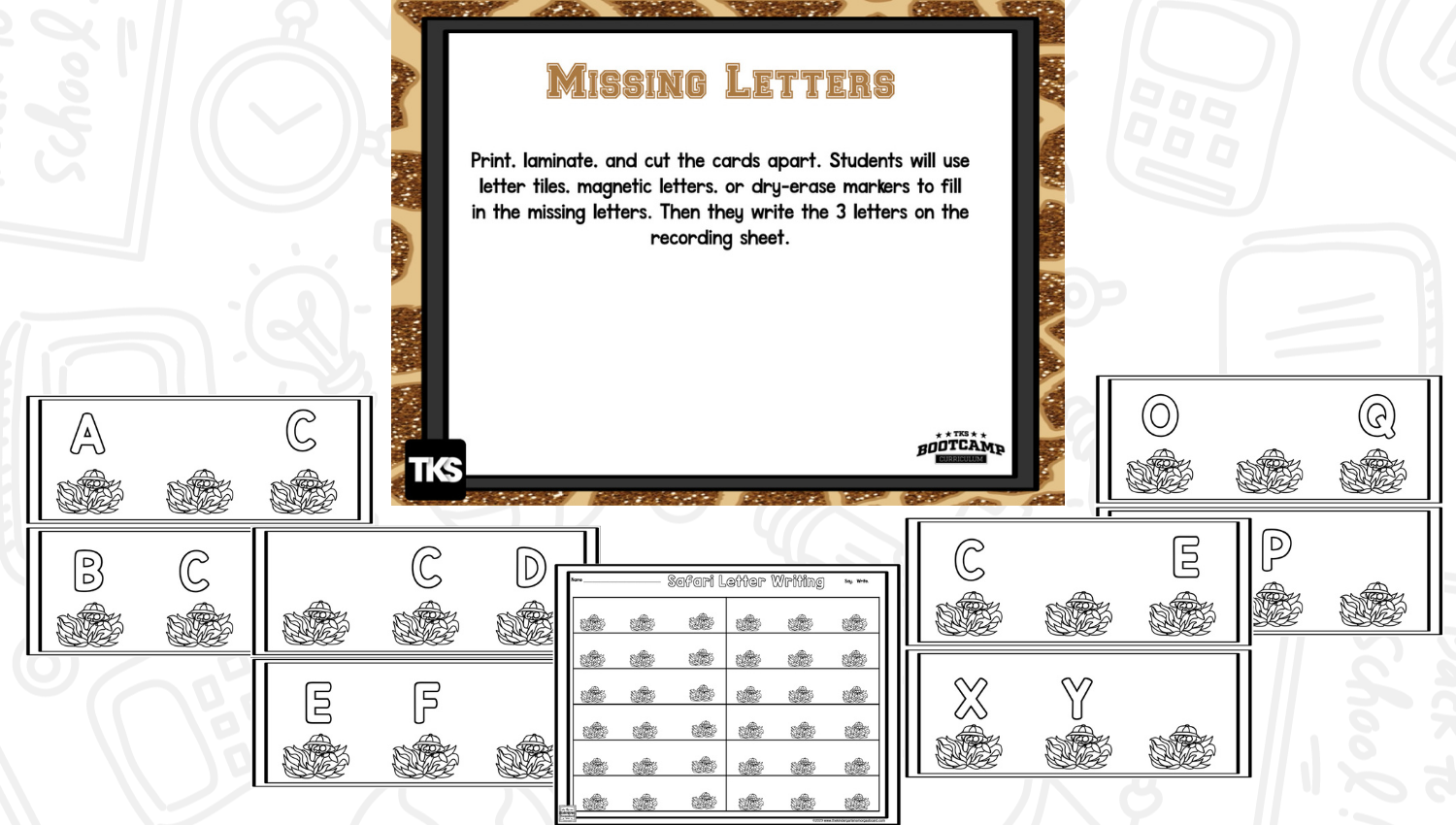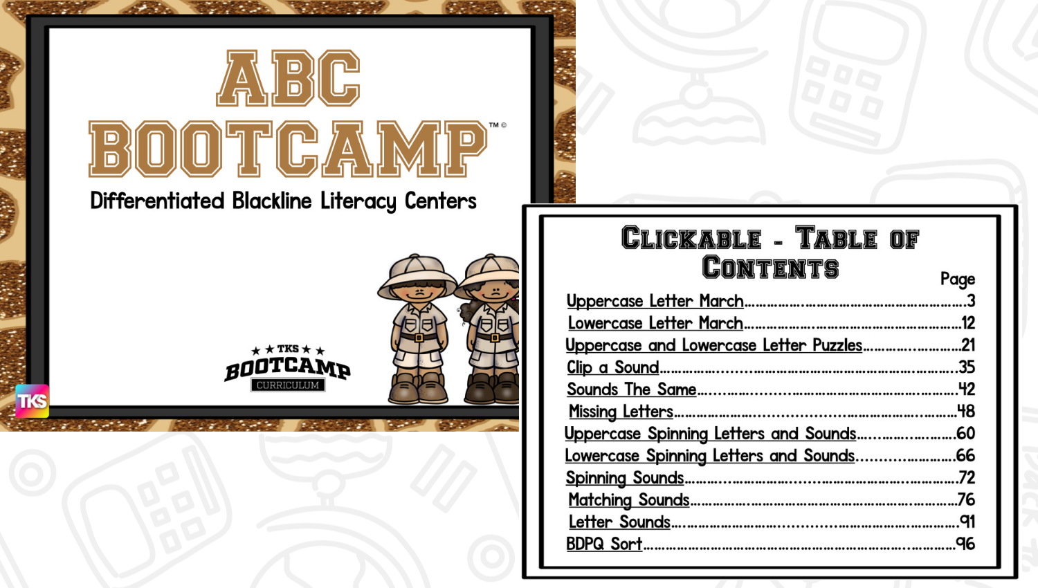 ABC Bootcamp® is available as part of our TKS Bootcamp™ Bundle which includes: ABC Bootcamp®, Number Bootcamp, Shapes Bootcamp, Blends Bootcamp, Word Family Bootcamp, Vowel Bootcamp, Addition Bootcamp, Subtraction Bootcamp & Vowel Teams Bootcamp. The TKS Bootcamp Bundle is discounted to 25% off the regular price of each product and is available in all 5 themes. CLICK HERE to visit the Bundles.