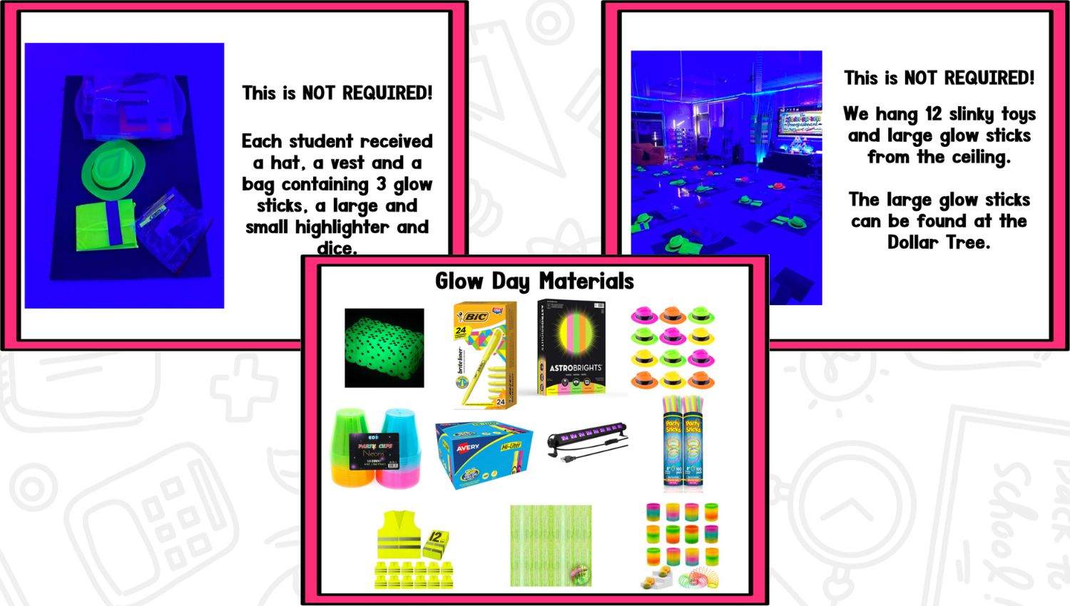 I added extra items to my GLOW day but know they are NOT REQUIRED. You can simply use highlighters and black lights.