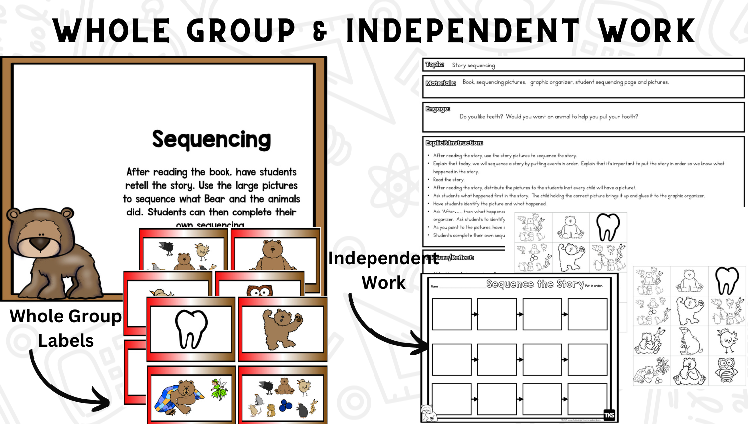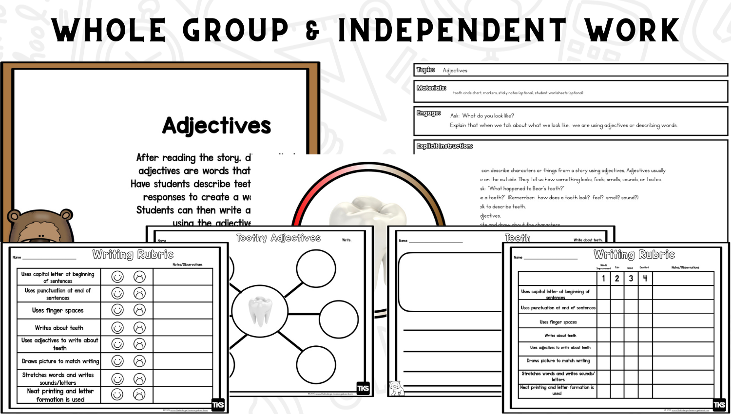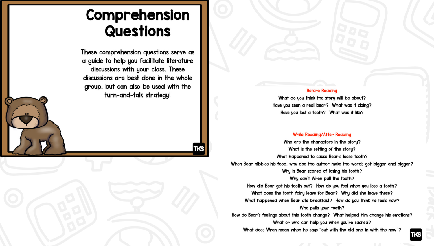 This all-inclusive resource is designed to accompany the book Bear's Loose Tooth. The reading activities allow students to build literacy and comprehension skills. Each activity can be done in a whole group or small group, and includes writing and drawing pages for student responses.