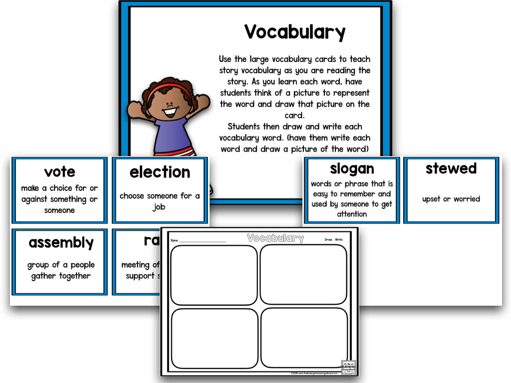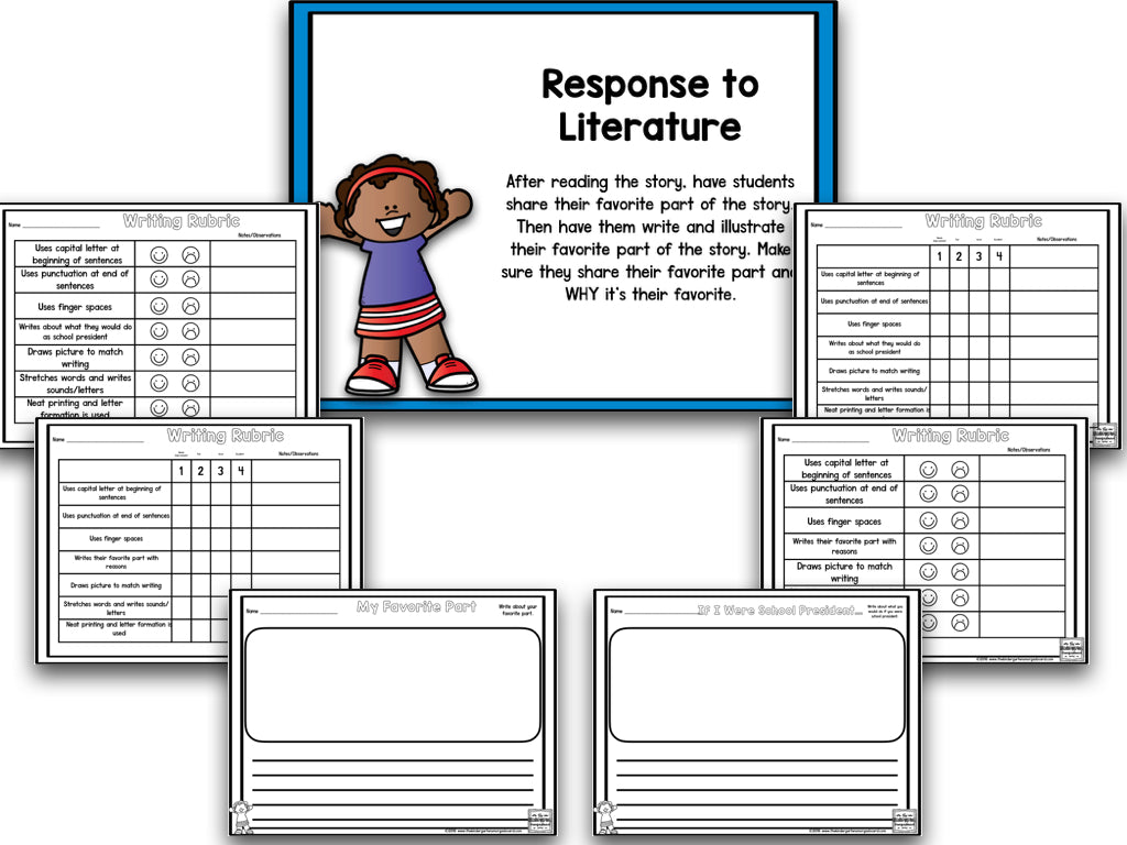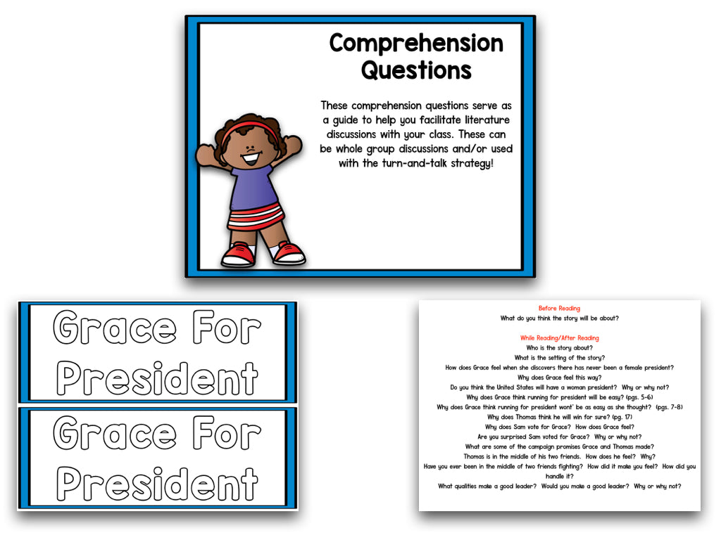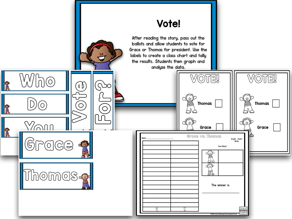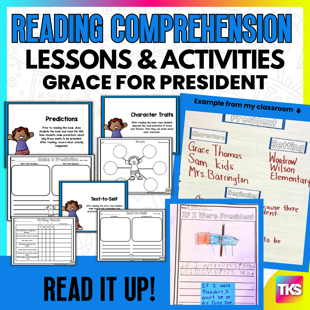 This Read It Up creation is an all-inclusive resource designed to accompany the book Grace for President. The activities in this reading resource allow students to build literacy and comprehension skills. Each activity can be done in a whole group or small group and includes writing and drawing pages for student responses.