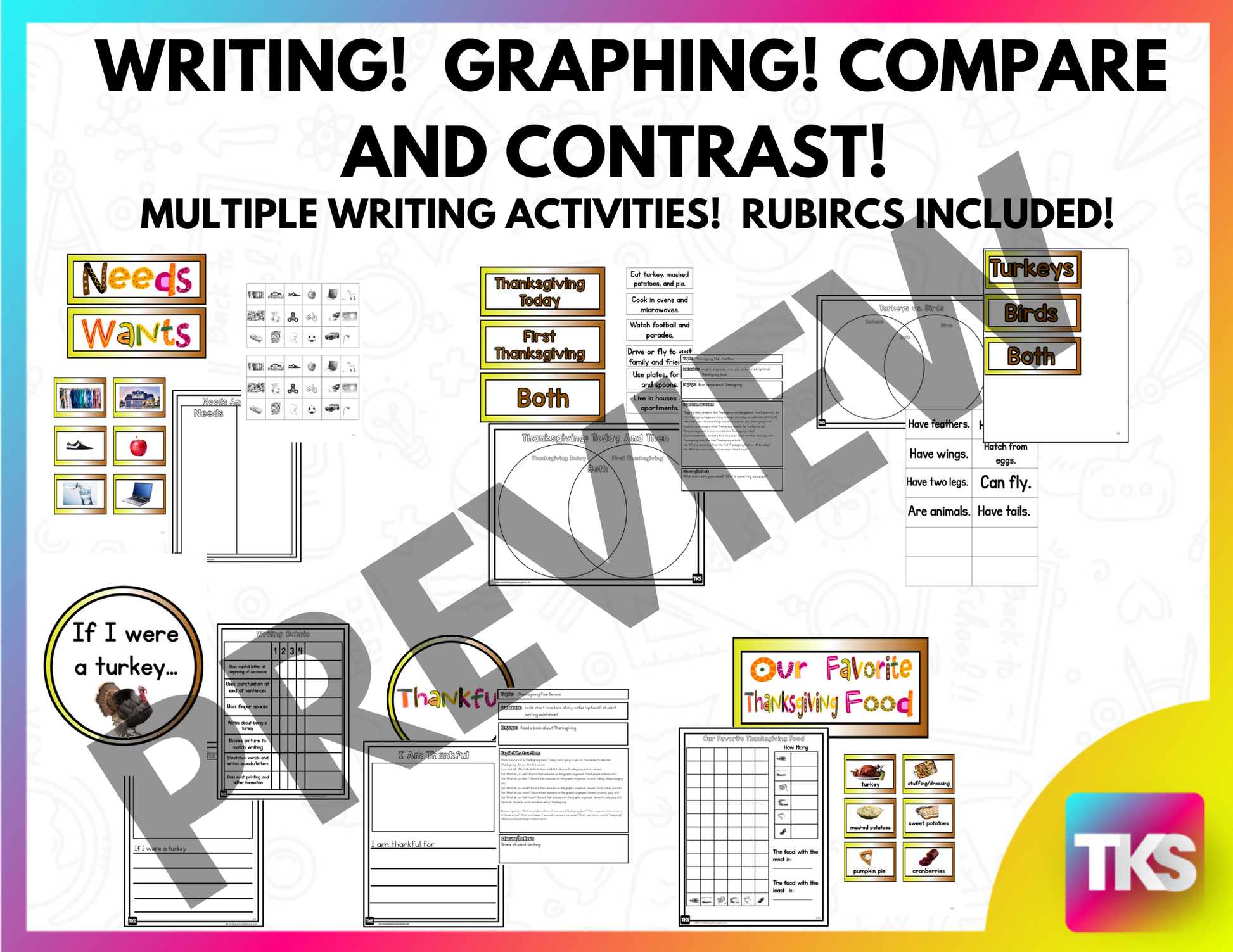 Students will explore the First Thanksgiving and Thanksgiving today, learn about turkeys, discuss needs and wants, and share what they’re thankful for—all while meeting standards in reading, writing, math, and social studies.