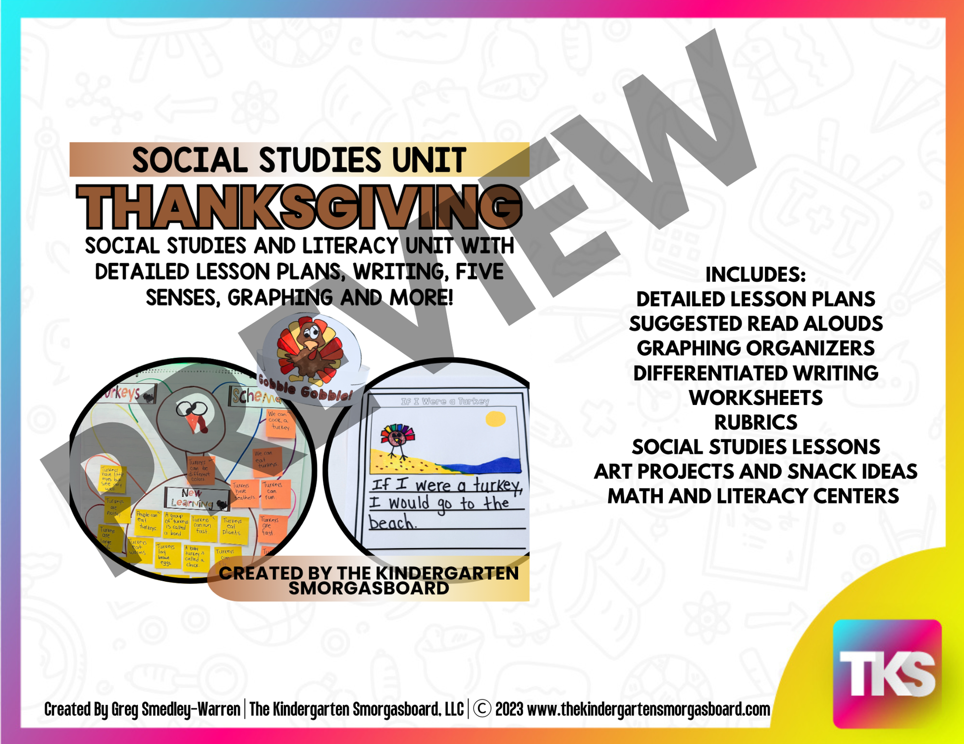 Perfect for Pre-K through 2nd Grade, this resource includes detailed lesson plans,graphic organizers, writing activities, art projects, snacks, disguise a turkey, and even Thanksgiving hats!