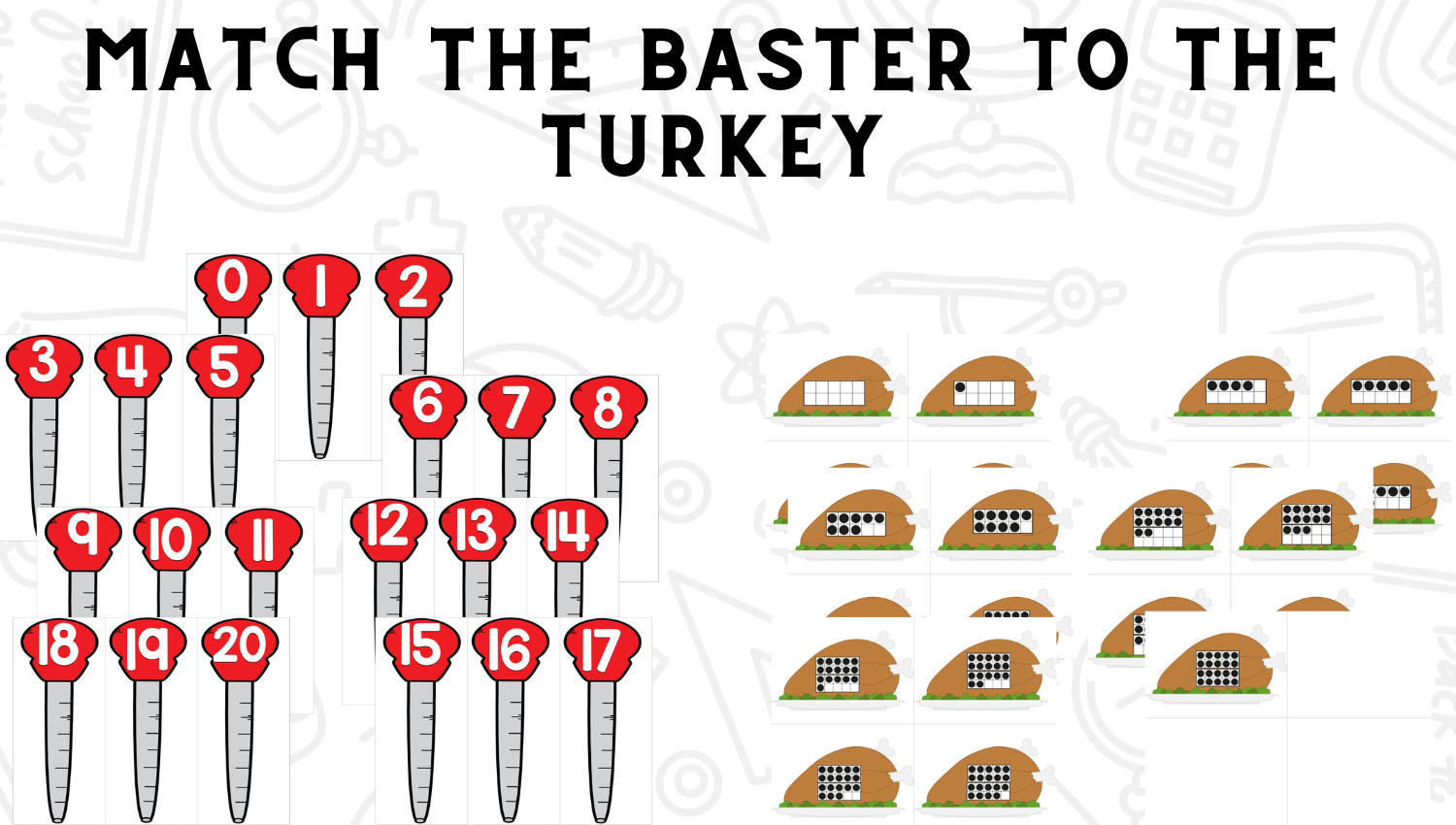 Your students will love learning numbers and practicing counting with basters to “baste” turkeys! They will be learning, building language, and having fun with this hands-on Thanksgiving math resource!