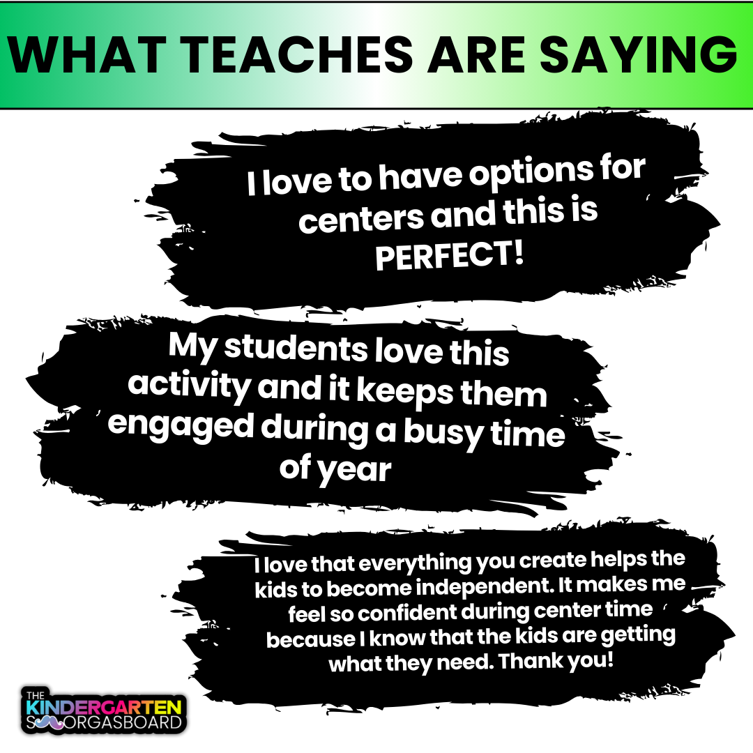 ⭐️⭐️⭐️⭐️⭐️ Leah J. says: “My students love these center activities! I have collected many of these activities made by Kindergarten Smorgasboard, and the predictability gives students the confidence to practice the skills they need, at the same time providing variety and excitement because of the themes. I appreciate the differentiation options. I began by just introducing the activity and introduced the worksheet supports following that.”