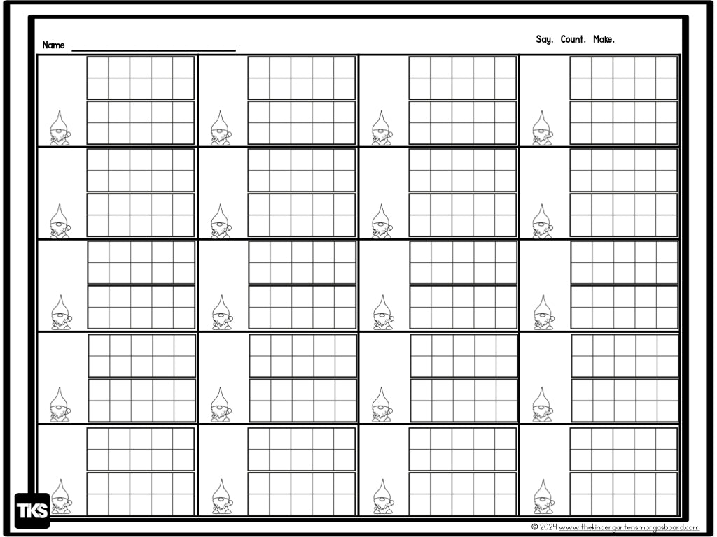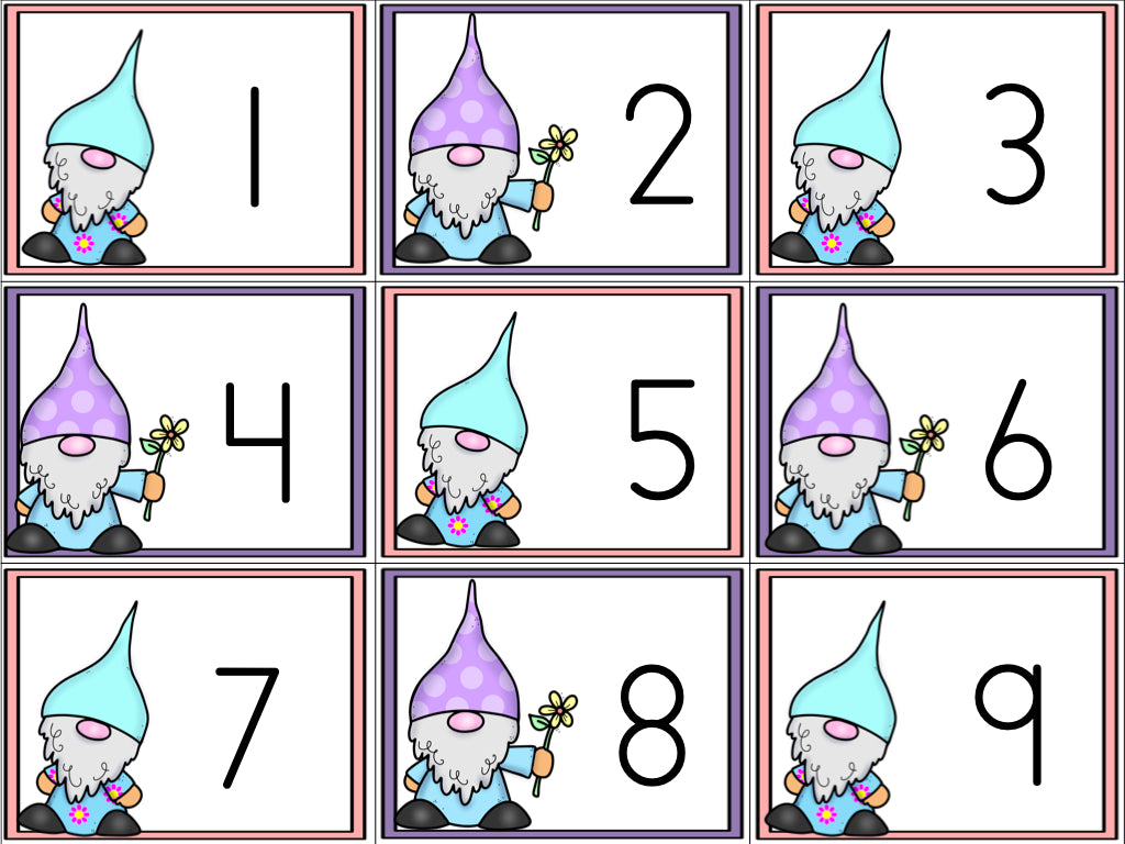 This spring counting game uses gnomes from Dollar Tree but it can also be used with any item or manipulative in your classroom. Simply print, laminate, and cut apart the cards. Students choose a card, say the number, and count the correct number of gnomes. On the recording sheet, write the number and make the ten frames.