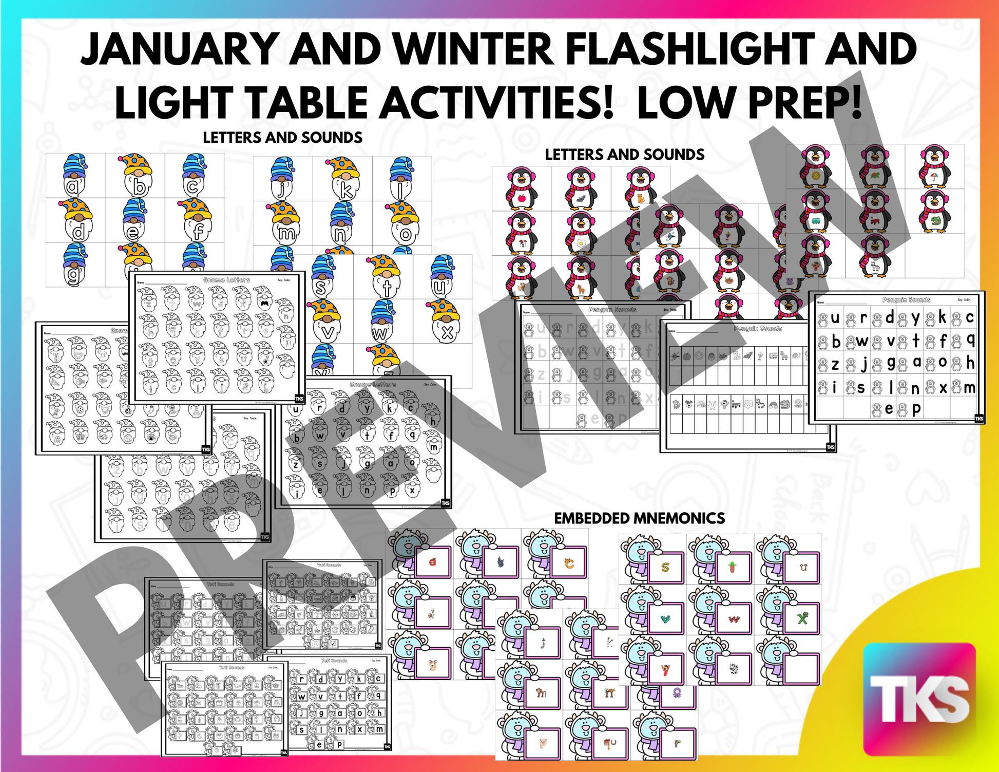Perfect for preschool, pre-k, kindergarten, and first-grade learners, these January, winter, penguin, and New Year-themed cards pair perfectly with a flashlight, light box, or light table for a magical, low-prep way to practice phonics and math skills.