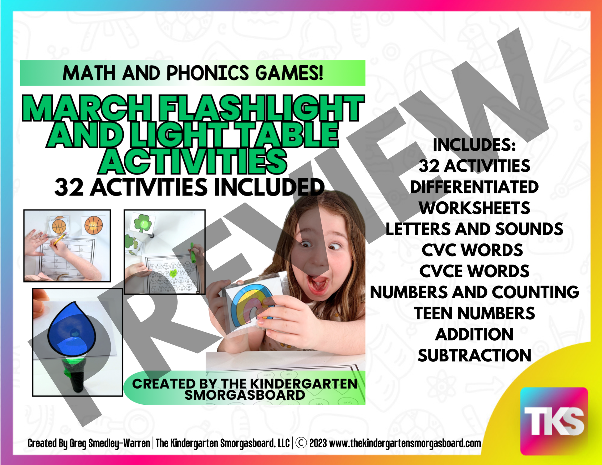 Perfect for preschool, pre-k, kindergarten, and first-grade learners, these March, St. Patrick's Day, weather, rainbows, and basketball-themed cards pair perfectly with a flashlight, light box, or light table for a magical, low-prep way to practice phonics and math skills.
