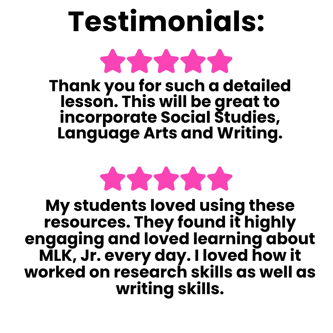 ⭐️⭐️⭐️⭐️⭐️ Jamie B. says: “My students loved using these resources. They found it highly engaging and loved learning about MLK, Jr. every day. I loved how it worked on research skills as well as writing skills.”