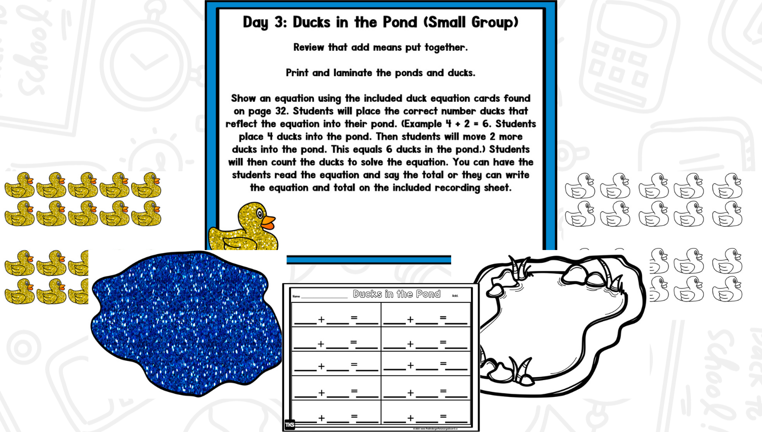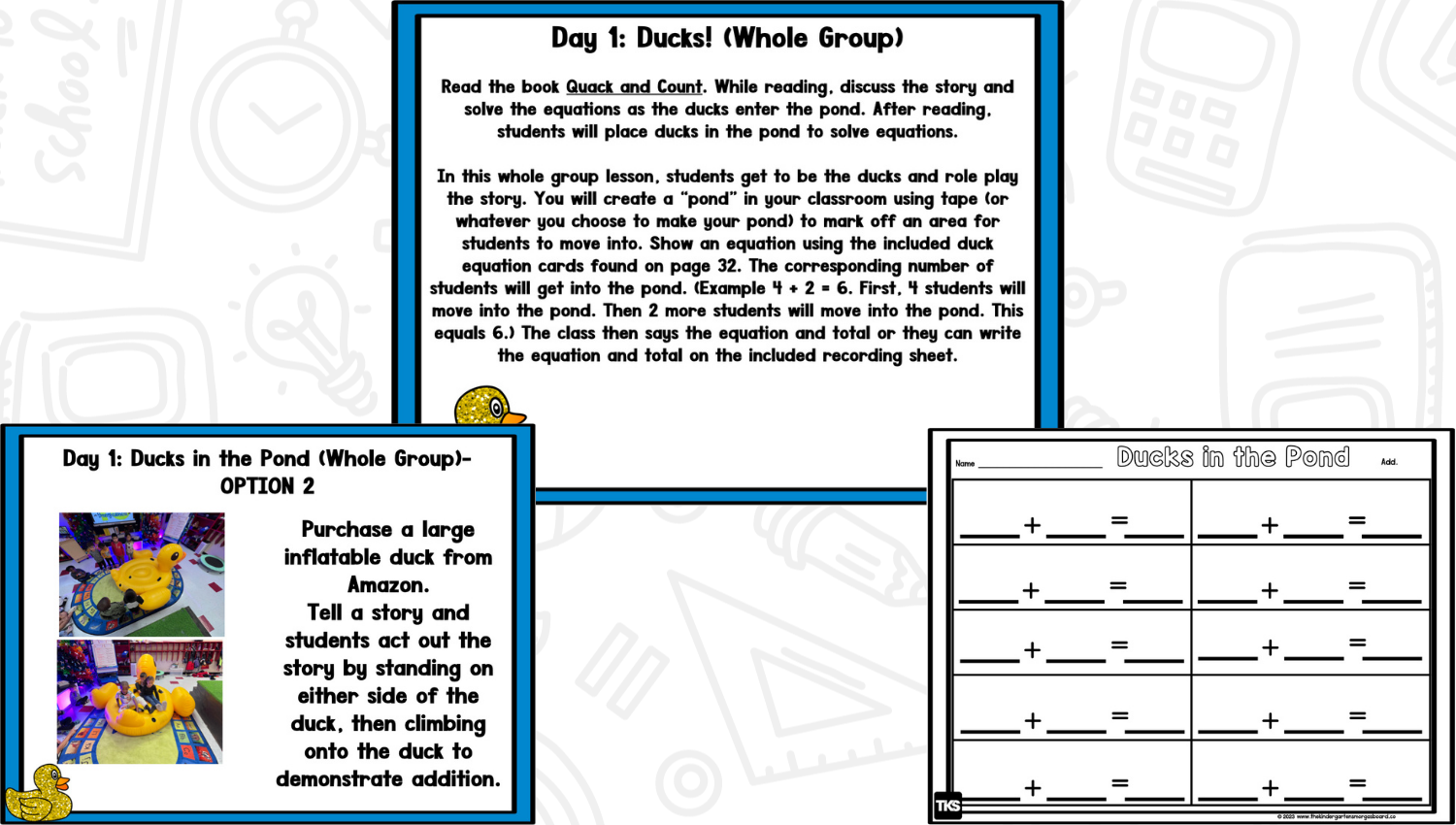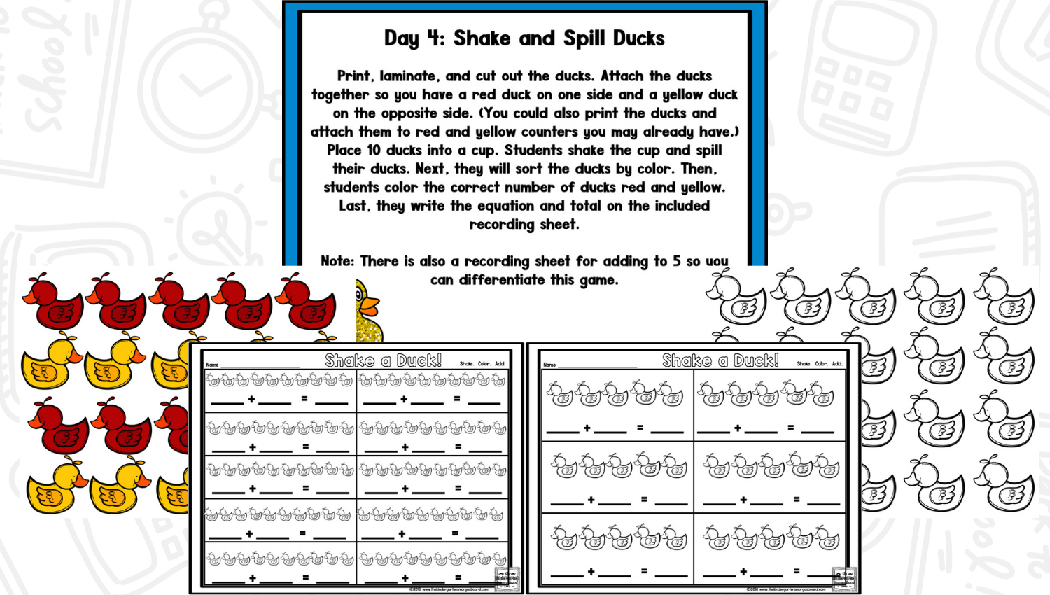 Make teaching addition to 10 fun with these engaging, hands-on duck-themed math activities! This set includes 5 days of low-prep lessons perfect for exploring and practicing addition to 10. Quick and easy setup plus clear directions make these activities perfect for whole group and small groups!