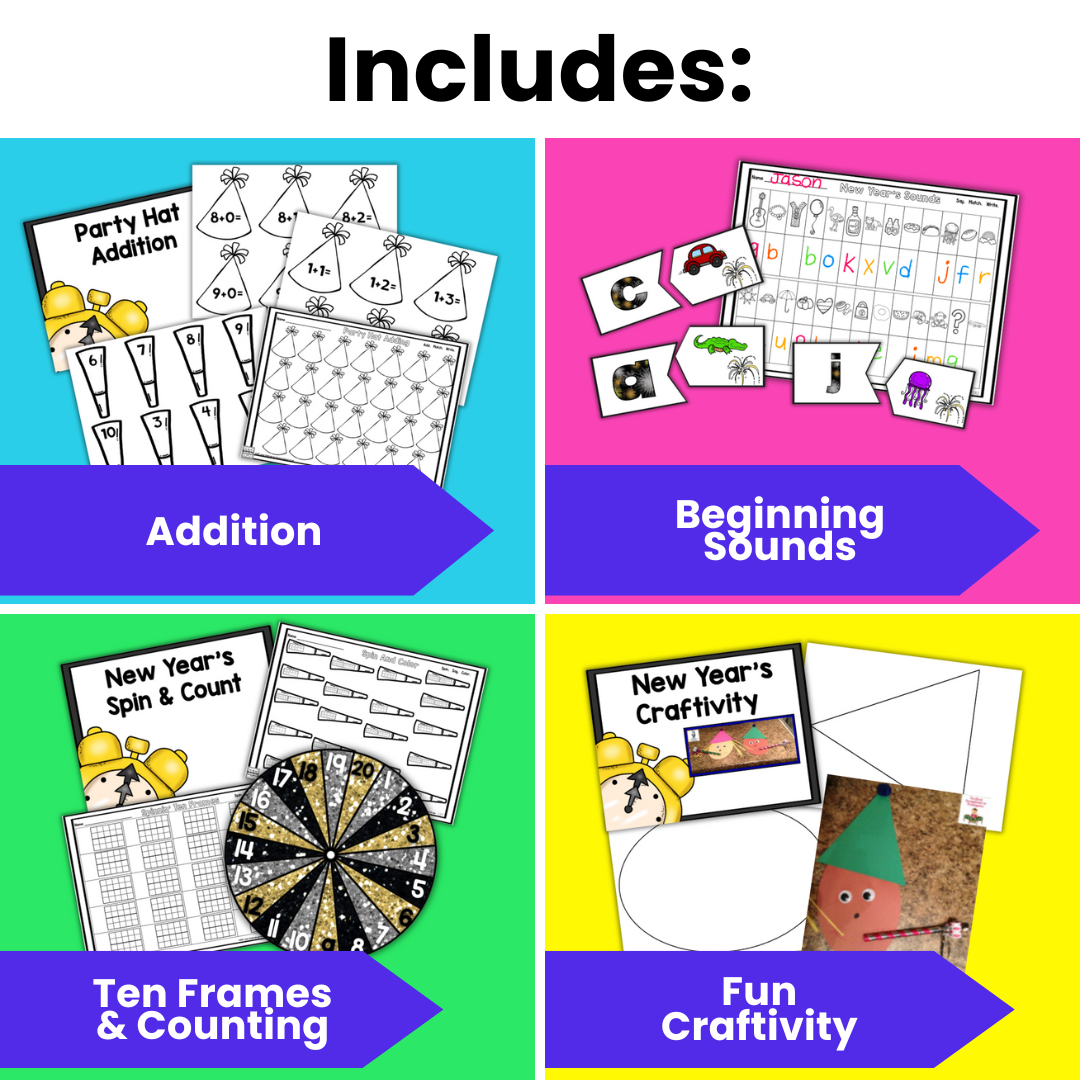 Make January's math and literacy centers fun with this Happy New Year resource! This set includes 12 different games and activities with a fun new year theme so students can practice their math and literacy skills. Also includes art projects and writing activities.