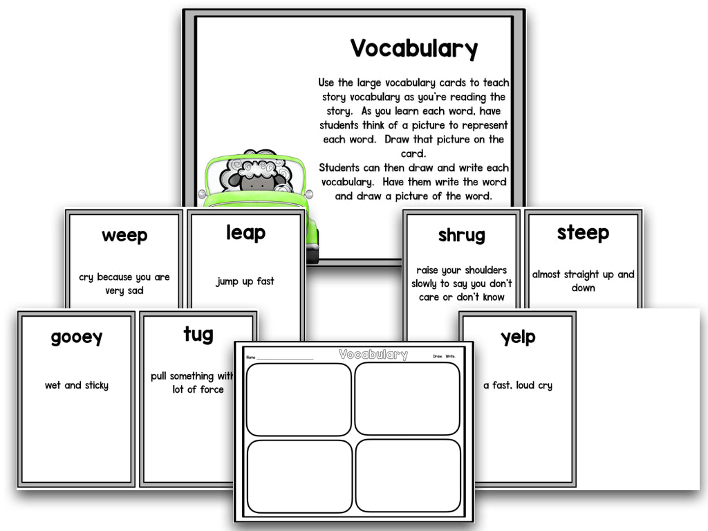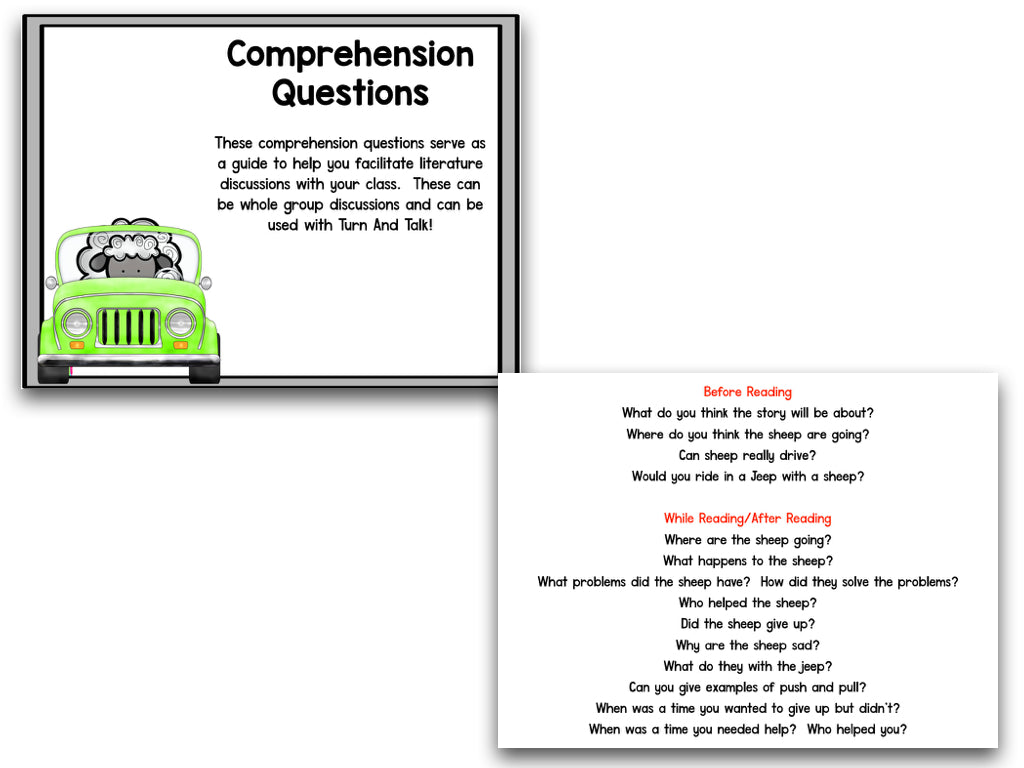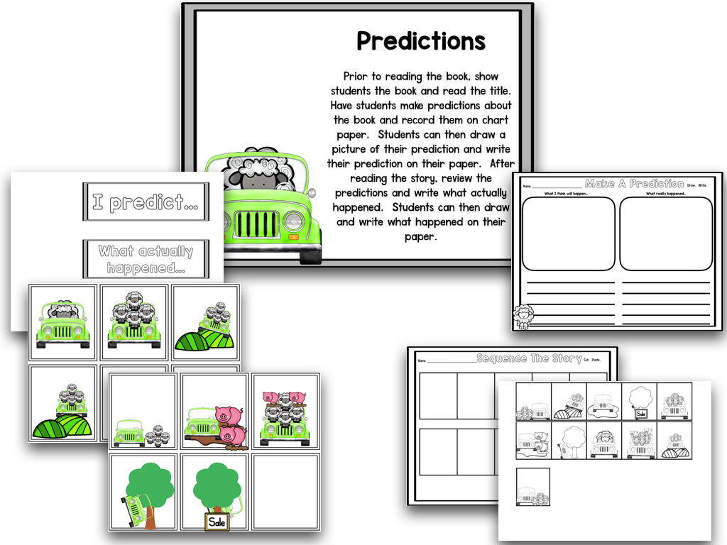 This Read It Up creation is designed to accompany the book Sheep in a Jeep and is an all-inclusive resource. The activities in this reading resource allow students to build literacy and comprehension skills. Each activity can be done in a whole group or small group and includes writing and drawing pages for student responses.
