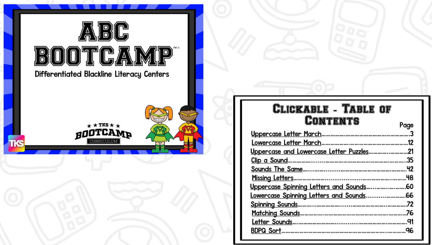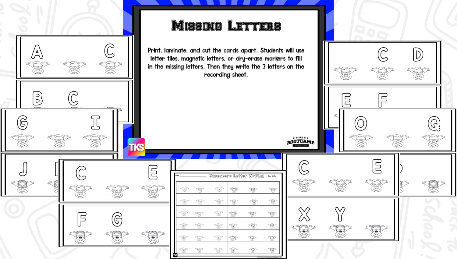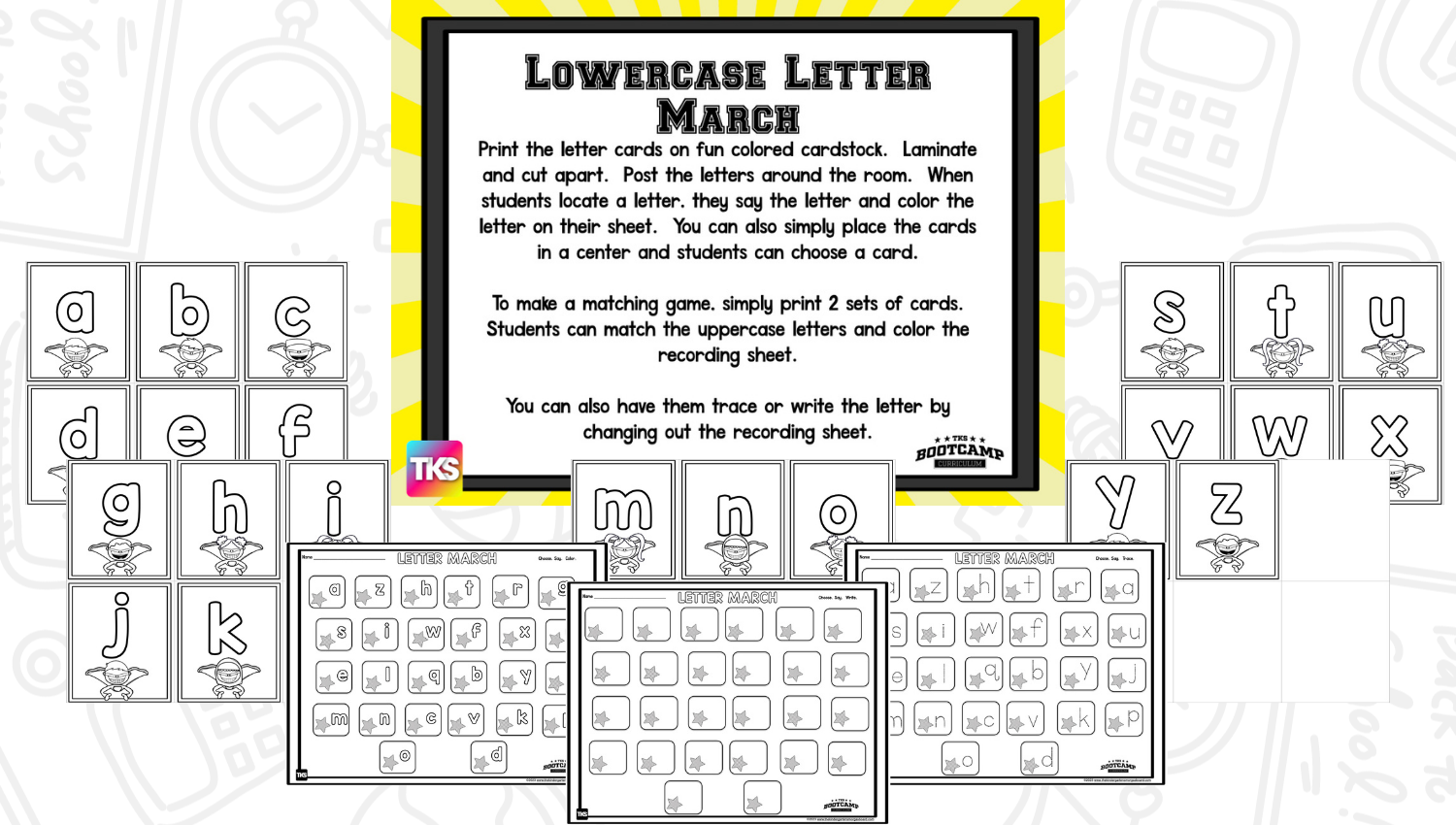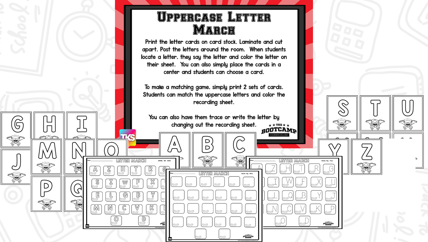 ABC Bootcamp® is available as part of our TKS Bootcamp® Bundle which includes: ABC Bootcamp, Number Bootcamp, Shapes Bootcamp, Blends Bootcamp, Word Family Bootcamp, Vowel Bootcamp, Addition Bootcamp, Subtraction Bootcamp & Vowel Teams Bootcamp. The TKS Bootcamp Bundle is discounted to 25% off the regular price of each product and is available in all 5 themes. CLICK HERE to visit the Bundles.